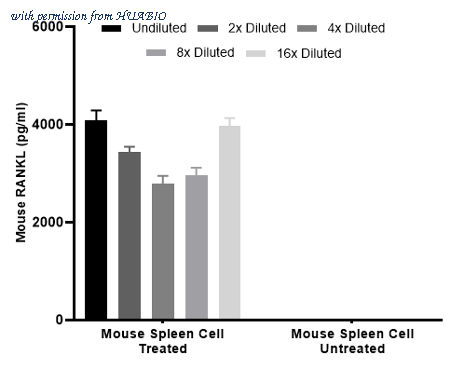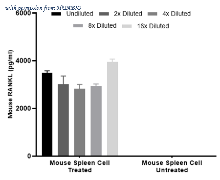 Interpolated concentrations of native RANKL in mouse spleen cell culture supernatant treated or untreated with concanavalin A for 3days . Interpolated concentration of native RANKL was measured in duplicate at different sample concentrations and interpolated from the RANKL standard curves. Undiluted samples were 100% cell supernatant. The interpolated dilution factor corrected values were plotted (mean +/- SD, n=2). The mean RANKL concentration was determined to be 3,251 pg/mL in neat mouse spleen cell treated supernatant, undetectable in untreated mouse spleen cell supernatant.