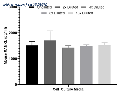 Interpolated concentrations of spiked RANKL in human cell culture media samples. The concentrations of RANKL were measured in duplicates, interpolated from the RANKL standard curves and corrected for sample dilution. Undiluted samples are as follows: cell culture media 50%. The interpolated dilution factor corrected values are plotted (mean +/- SD, n=2).