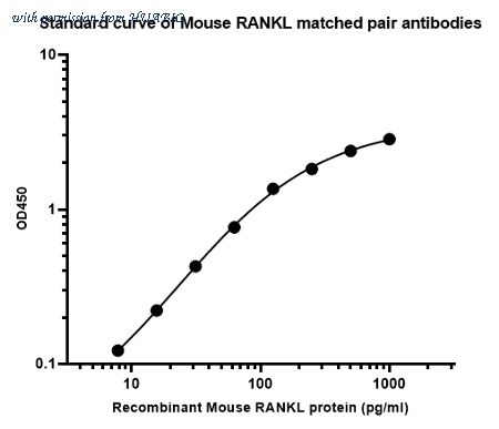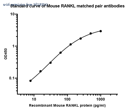 Sandwich ELISA analysis of mouse RANKL matched pair antibodies Elisa assay was performed by coating wells of a 96-well plate with 100 µl per well of capture antibody (HA722923) diluted in carbonate/bicarbonate buffer, at a concentration of 5 µg/ml overnight at 4℃. Wells of the plate were washed, blocked with 150 µl 0.05% tween-20 1%BSA blocking buffer, and incubated with serial diluted Recombinant Mouse RANKL protein (HA210558) starting from 8000 pg/ml to 0 pg/ml and detect antibody (HA722924, Biotin, 0.2 µg/ml) for 1 hour at 30℃ with shaking. Then the plate was washed and incubated with 100 µl per well of SA-HRP for 0.5 hour at 30℃ with shaking. Detection was performed using an Ultra TMB Substrate for 10 minutes at room temperature in the dark. The reaction was stopped with sulfuric acid and absorbances were read on a spectrophotometer at 450 nm.