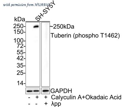 Western blot analysis of Phospho-Tuberin (T1462) on different lysates with Rabbit anti-Phospho-Tuberin (T1462) antibody (HA721792) at 1/1,000 dilution. Lane 1: SH-SY5Y cell lysate Lane 2: SH-SY5Y treated with 200nM Calyculin A and 1μM Okadaic Acid for 1 hour cell lysate Lane 3: SH-SY5Y treated with 200nM Calyculin A and 1μM Okadaic Acid for 1 hour, then treated with λpp for 1 hour cell lysate Lysates/proteins at 20 µg/Lane. Predicted band size: 201 kDa Observed band size: 250 kDa Exposure time: 3 minutes; 4-20% SDS-PAGE gel. Proteins were transferred to a PVDF membrane and blocked with 5% NFDM/TBST for 1 hour at room temperature. The primary antibody (HA721792) at 1/1,000 dilution was used in 5% NFDM/TBST at 4℃ overnight. Goat Anti-Rabbit IgG - HRP Secondary Antibody (HA1001) at 1/50,000 dilution was used for 1 hour at room temperature.