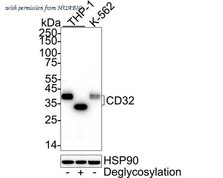 Western blot analysis of CD32 on different lysates with Rabbit anti-CD32 antibody (HA750382) at 1/2,000 dilution. Lane 1: THP-1 cell lysate Lane 2: THP-1 cell lysate treated with deglycosylation Lane 3: K-562 cell lysate Lysates/proteins at 20 µg/Lane. Predicted band size: 35 kDa Observed band size: 40/31 kDa Exposure time: 3 minutes; ECL: K1801; 4-20% SDS-PAGE gel. Proteins were transferred to a PVDF membrane and blocked with 5% NFDM/TBST for 1 hour at room temperature. The primary antibody (HA750382) at 1/2,000 dilution was used in 5% NFDM/TBST at 4℃ overnight. Goat Anti-Rabbit IgG - HRP Secondary Antibody (HA1001) at 1/50,000 dilution was used for 1 hour at room temperature.