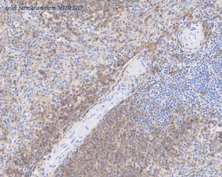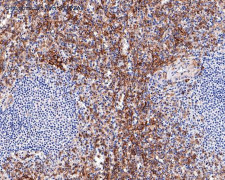 Immunohistochemical analysis of paraffin-embedded human spleen tissue with Rabbit anti-CD32A + CD32B + CD32C antibody (HA721930) at 1/2,000 dilution. The section was pre-treated using heat mediated antigen retrieval with Tris-EDTA buffer (pH 9.0) for 20 minutes. The tissues were blocked in 1% BSA for 20 minutes at room temperature, washed with ddH2O and PBS, and then probed with the primary antibody (HA721930) at 1/2,000 dilution for 1 hour at room temperature. The detection was performed using an HRP conjugated compact polymer system. DAB was used as the chromogen. Tissues were counterstained with hematoxylin and mounted with DPX.