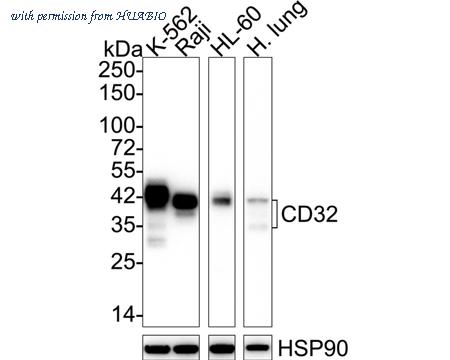 Western blot analysis of CD32A + CD32B + CD32C on different lysates with Rabbit anti-CD32A + CD32B + CD32C antibody (HA721930) at 1/1,000 dilution. Lane 1: K-562 cell lysate (20 µg/Lane) Lane 2: Raji cell lysate (20 µg/Lane) Lane 3: HL-60 cell lysate (20 µg/Lane) Lane 4: Human lung tissue lysate (30 µg/Lane) Predicted band size: 35 kDa Observed band size: 35-40 kDa Exposure time: 3 minutes; ECL: K1801; 4-20% SDS-PAGE gel. Proteins were transferred to a PVDF membrane and blocked with 5% NFDM/TBST for 1 hour at room temperature. The primary antibody (HA721930) at 1/1,000 dilution was used in 5% NFDM/TBST at 4℃ overnight. Goat Anti-Rabbit IgG - HRP Secondary Antibody (HA1001) at 1/50,000 dilution was used for 1 hour at room temperature.