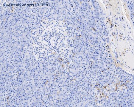 Immunohistochemical analysis of paraffin-embedded human pancreas tissue with Rabbit anti-CD32A + CD32B + CD32C antibody (HA721930) at 1/2,000 dilution. The section was pre-treated using heat mediated antigen retrieval with Tris-EDTA buffer (pH 9.0) for 20 minutes. The tissues were blocked in 1% BSA for 20 minutes at room temperature, washed with ddH2O and PBS, and then probed with the primary antibody (HA721930) at 1/2,000 dilution for 1 hour at room temperature. The detection was performed using an HRP conjugated compact polymer system. DAB was used as the chromogen. Tissues were counterstained with hematoxylin and mounted with DPX.