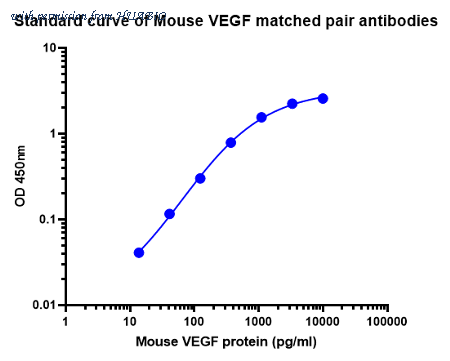Sandwich ELISA analysis of Mouse VEGF matched pair antibodies. Elisa assay was performed by coating wells of a 96-well plate with 100 µl per well of capture antibody (HA721850) diluted in carbonate/bicarbonate buffer, at a concentration of 2 µg/ml overnight at 4℃. Wells of the plate were washed, blocked with 150 µl 0.05% tween-20 1%BSA blocking buffer, and incubated with serial diluted Mouse VEGF protein starting from 10000 pg/ml to 0 pg/ml and detect antibody [PSH02-72]-Biotin for 1 hour at 30℃ with shaking. Then the plate was washed and incubated with 100 µl per well of SA-HRP for 0.5 hour at 30℃ with shaking. Detection was performed using an Ultra TMB Substrate for 10 minutes at room temperature in the dark. The reaction was stopped with sulfuric acid and absorbances were read on a spectrophotometer at 450 nm.