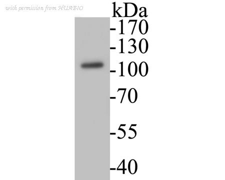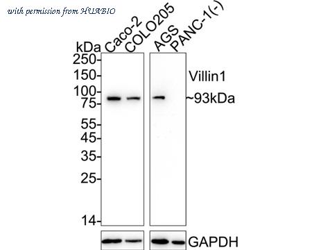 Western blot analysis of Villin1 on different lysates with Rabbit anti-Villin1 antibody (ET7106-62) at 1/5,000 dilution. Lane 1: Caco-2 cell lysate (20 µg/Lane) Lane 2: COLO205 cell lysate (20 µg/Lane) Lane 3: AGS cell lysate (20 µg/Lane) Lane 4: PANC-1 cell lysate (negative) (20 µg/Lane) Predicted band size: 93 kDa Observed band size: 93 kDa Exposure time: Lane 1-2: 16 seconds; Lane 3-4: 3 minutes; ECL: K1801; 4-20% SDS-PAGE gel. Proteins were transferred to a PVDF membrane and blocked with 5% NFDM/TBST for 1 hour at room temperature. The primary antibody (ET7106-62) at 1/5,000 dilution was used in 5% NFDM/TBST at 4℃ overnight. Goat Anti-Rabbit IgG - HRP Secondary Antibody (HA1001) at 1/50,000 dilution was used for 1 hour at room temperature.