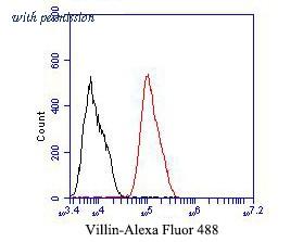 Flow cytometric analysis of Villin1 was done on HCT116 cells. The cells were fixed, permeabilized and stained with the primary antibody (ER1901-31, 1/50) (red). After incubation of the primary antibody at room temperature for an hour, the cells were stained with a Alexa Fluor 488-conjugated Goat anti-Rabbit IgG Secondary antibody at 1/1000 dilution for 30 minutes.Unlabelled sample was used as a control (cells without incubation with primary antibody; black).