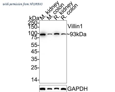Western blot analysis of Villin1 on different lysates with Rabbit anti-Villin1 antibody (ET7106-62) at 1/2,000 dilution. Lane 1: Mouse kidney tissue lysate Lane 2: Mouse colon tissue lysate Lane 3: Rat kidney tissue lysate Lane 4: Rat colon tissue lysate Lysates/proteins at 20 µg/Lane. Predicted band size: 93 kDa Observed band size: 93 kDa Exposure time: 25 seconds; ECL: K1801; 4-20% SDS-PAGE gel. Proteins were transferred to a PVDF membrane and blocked with 5% NFDM/TBST for 1 hour at room temperature. The primary antibody (ET7106-62) at 1/2,000 dilution was used in 5% NFDM/TBST at 4℃ overnight. Goat Anti-Rabbit IgG - HRP Secondary Antibody (HA1001) at 1/50,000 dilution was used for 1 hour at room temperature.