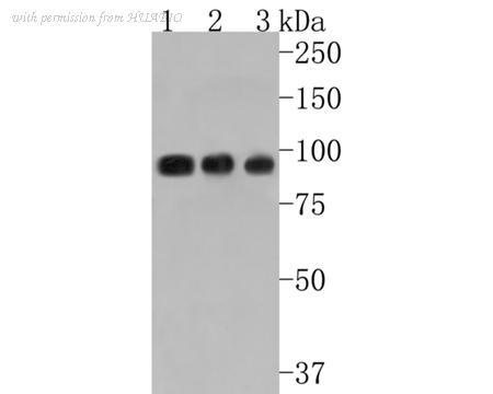 Western blot analysis of Villin1 on different lysates. Proteins were transferred to a PVDF membrane and blocked with 5% BSA in PBS for 1 hour at room temperature. The primary antibody (HA500509, 1/2,000) was used in 5% BSA at room temperature for 2 hours. Goat Anti-Rabbit IgG - HRP Secondary Antibody (HA1001) at 1:200,000 dilution was used for 1 hour at room temperature. Positive control: Lane 1: Mouse colon tissue lysate Lane 2: Rat kidney tissue lysate Lane 2: Rat colon tissue lysate