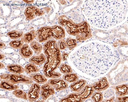 Immunohistochemical analysis of paraffin-embedded human kidney tissue using anti-Villin1 antibody. The section was pre-treated using heat mediated antigen retrieval with Tris-EDTA buffer (pH 9.0) for 20 minutes.The tissues were blocked in 1% BSA for 30 minutes at room temperature, washed with ddH2O and PBS, and then probed with the primary antibody (HA500509, 1/600) for 30 minutes at room temperature. The detection was performed using an HRP conjugated compact polymer system. DAB was used as the chromogen. Tissues were counterstained with hematoxylin and mounted with DPX.