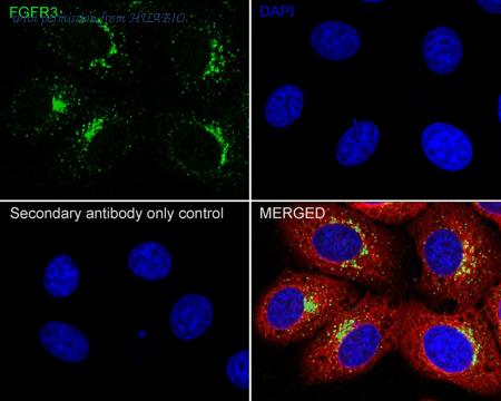Immunocytochemistry analysis of HepG2 cells labeling FGFR3 with Rabbit anti-FGFR3 antibody (HA750379) at 1/100 dilution. Cells were fixed in 4% paraformaldehyde for 20 minutes at room temperature, permeabilized with 0.1% Triton X-100 in PBS for 5 minutes at room temperature, then blocked with 1% BSA in 10% negative goat serum for 1 hour at room temperature. Cells were then incubated with Rabbit anti-FGFR3 antibody (HA750379) at 1/100 dilution in 1% BSA in PBST overnight at 4 ℃. Goat Anti-Rabbit IgG H&L (iFluor™ 488, HA1121) was used as the secondary antibody at 1/1,000 dilution. PBS instead of the primary antibody was used as the secondary antibody only control. Nuclear DNA was labelled in blue with DAPI. Beta tubulin (M1305-2, red) was stained at 1/100 dilution overnight at +4℃. Goat Anti-Mouse IgG H&L (iFluor™ 594, HA1126) was used as the secondary antibody at 1/1,000 dilution.