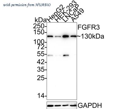 Western blot analysis of FGFR3 on different lysates with Rabbit anti-FGFR3 antibody (HA750379) at 1/5,000 dilution. Lane 1: HepG2 cell lysate (15 µg/Lane) Lane 2: HEK-293 cell lysate (15 µg/Lane) Lane 3: LNCaP cell lysate (15 µg/Lane) Lane 4: A549 cell lysate (15 µg/Lane) Predicted band size: 88 kDa Observed band size: 130 kDa Exposure time: 3 minutes; 4-20% SDS-PAGE gel. Proteins were transferred to a PVDF membrane and blocked with 5% NFDM/TBST for 1 hour at room temperature. The primary antibody (HA750379) at 1/5,000 dilution was used in 5% NFDM/TBST at 4℃ overnight. Goat Anti-Rabbit IgG - HRP Secondary Antibody (HA1001) at 1:50,000 dilution was used for 1 hour at room temperature.