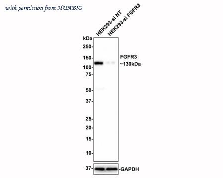 Western blot analysis of FGFR3 on different lysates with Rabbit anti-FGFR3 antibody (HA750379) at 1/1,000 dilution. Lane 1: HEK293-si NT cell lysate Lane 2: HEK293-si FGFR3 cell lysate Lysates/proteins at 10 µg/Lane. Predicted band size: 88 kDa Observed band size: 130 kDa Exposure time: 3 minutes; 4-20% SDS-PAGE gel. ET1703-36 was shown to specifically react with FGFR3 in HEK293-si NT cells. Weakened band was observed when HEK293-si FGFR3 sample was tested. HEK293-si NT and HEK293-si FGFR3 samples were subjected to SDS-PAGE. Proteins were transferred to a PVDF membrane and blocked with 5% NFDM in TBST for 1 hour at room temperature. The primary antibody (ET1703-36, 1/1,000) and Loading control antibody (Rabbit anti-GAPDH, ET1601-4, 1/10,000) were used in 5% BSA at room temperature for 2 hours. Goat Anti-rabbit IgG-HRP Secondary Antibody (HA1001) at 1:50,000 dilution was used for 1 hour at room temperature.