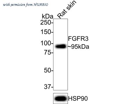 Western blot analysis of FGFR3 on Rat skin tissue lysates with Rabbit anti-FGFR3 antibody (HA750388) at 1/1,000 dilution. Lysates/proteins at 20 µg/Lane. Predicted band size: 88 kDa Observed band size: 95 kDa Exposure time: 8 seconds; 8% SDS-PAGE gel. Proteins were transferred to a PVDF membrane and blocked with 5% NFDM/TBST for 1 hour at room temperature. The primary antibody (HA750388) at 1/1,000 dilution was used in 5% NFDM/TBST at room temperature for 2 hours. Goat Anti-Rabbit IgG - HRP Secondary Antibody (HA1001) at 1:10,000 dilution was used for 1 hour at room temperature.
