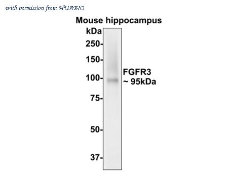 Western blot analysis of FGFR3 on Mouse hippocampus lysates with Rabbit anti-FGFR3 antibody (HA750388) at 1/500 dilution. Lysates/proteins at 20 µg/Lane. Predicted band size: 88 kDa Observed band size: 95 kDa Exposure time: 1 minute; 8% SDS-PAGE gel. Proteins were transferred to a PVDF membrane and blocked with 5% NFDM/TBST for 1 hour at room temperature. The primary antibody (HA750388) at 1/500 dilution was used in 5% NFDM/TBST at room temperature for 2 hours. Goat Anti-Rabbit IgG - HRP Secondary Antibody (HA1001) at 1:40,000 dilution was used for 1 hour at room temperature.