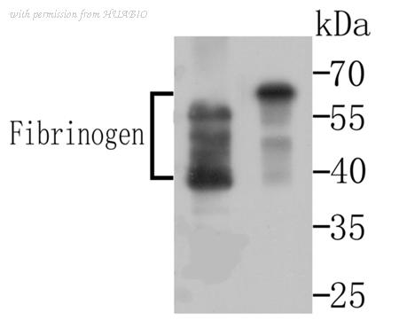 Western blot analysis of Fibrinogen on mouse bone marrow and human kidney tissue lysates using anti-Fibrinogen antibody at 1/500 dilution.
