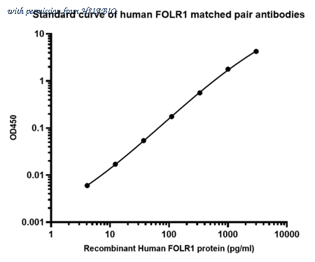 Sandwich ELISA analysis of human FOLR1 matched pair antibodies Elisa assay was performed by coating wells of a 96-well plate with 100 µl per well of capture antibody (HA723354) diluted in carbonate/bicarbonate buffer, at a concentration of 2ug/ml overnight at 4℃. Wells of the plate were washed, blocked with 150 µl 0.05% tween-20 1% BSA blocking buffer, and incubated with serial diluted Recombinant human FOLR1 protein (HA211055) starting from 3,000 pg/ml to 0 pg/ml and detect antibody (HA723355, Biotin, 0.05 µg/ml) for 1 hour at 30℃ with shaking. Then the plate was washed and incubated with 100 µl per well of SA-HRP for 0.5 hour at 30℃ with shaking. Detection was performed using an Ultra TMB Substrate for 10 minutes at room temperature in the dark. The reaction was stopped with sulfuric acid and absorbances were read on a spectrophotometer at 450 nm.