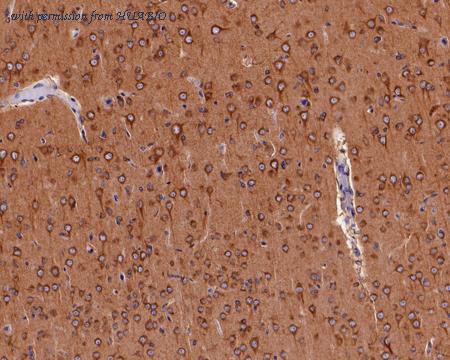Immunohistochemical analysis of paraffin-embedded rat brain tissue with Mouse anti-FAM38A / PIEZO1 antibody (HA601100) at 1/1,000 dilution. The section was pre-treated using heat mediated antigen retrieval with Tris-EDTA buffer (pH 9.0) for 20 minutes. The tissues were blocked in 1% BSA for 20 minutes at room temperature, washed with ddH2O and PBS, and then probed with the primary antibody (HA601100) at 1/1,000 dilution for 1 hour at room temperature. The detection was performed using an HRP conjugated compact polymer system. DAB was used as the chromogen. Tissues were counterstained with hematoxylin and mounted with DPX.