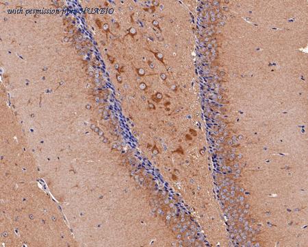 Immunohistochemical analysis of paraffin-embedded mouse hippocampus tissue with Mouse anti-FAM38A / PIEZO1 antibody (HA601100) at 1/200 dilution. The section was pre-treated using heat mediated antigen retrieval with Tris-EDTA buffer (pH 9.0) for 20 minutes. The tissues were blocked in 1% BSA for 20 minutes at room temperature, washed with ddH2O and PBS, and then probed with the primary antibody (HA601100) at 1/200 dilution for 1 hour at room temperature. The detection was performed using an HRP conjugated compact polymer system. DAB was used as the chromogen. Tissues were counterstained with hematoxylin and mounted with DPX.