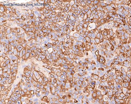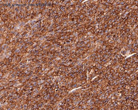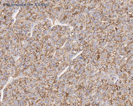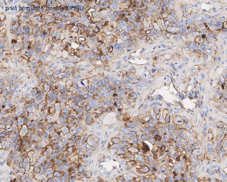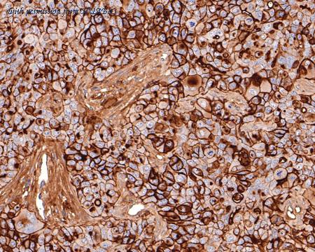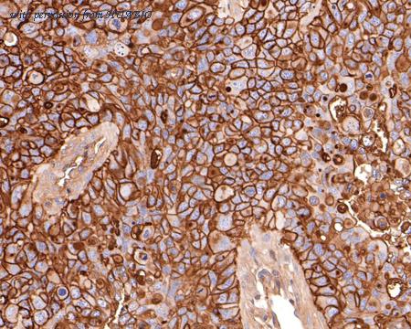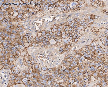 Immunohistochemical analysis of paraffin-embedded NCI-H441 xenograft tissue with Mouse anti-CD73 antibody (HA610172) at 1/1,000 dilution. The section was pre-treated using heat mediated antigen retrieval with Tris-EDTA buffer (pH 9.0) for 20 minutes. The tissues were blocked in 1% BSA for 20 minutes at room temperature, washed with ddH2O and PBS, and then probed with the primary antibody (HA610172) at 1/1,000 dilution for 1 hour at room temperature. The detection was performed using an HRP conjugated compact polymer system. DAB was used as the chromogen. Tissues were counterstained with hematoxylin and mounted with DPX.