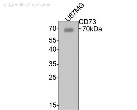 Western blot analysis of CD73 on U-87 MG cell lysates with Mouse anti-CD73 antibody (HA601010) at 1/500 dilution. Lysates/proteins at 10 µg/Lane. Predicted band size: 63 kDa Observed band size: 70 kDa Exposure time: 15 seconds; 12% SDS-PAGE gel. Proteins were transferred to a PVDF membrane and blocked with 5% NFDM/TBST for 1 hour at room temperature. The primary antibody (HA601010) at 1/500 dilution was used in 5% NFDM/TBST at room temperature for 2 hours. Goat Anti-Mouse IgG - HRP Secondary Antibody (HA1006) at 1:100,000 dilution was used for 1 hour at room temperature.