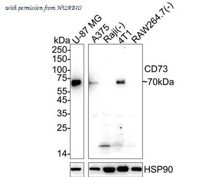 Western blot analysis of CD73 on different lysates with Mouse anti-CD73 antibody (HA601011) at 1/2,000 dilution. Lane 1: U-87 MG cell lysate Lane 2: A375 cell lysate Lane 3: Raji cell lysate (negative) Lane 4: 4T1 cell lysate Lane 5: RAW264.7 cell lysate (negative) Lysates/proteins at 20 µg/Lane. Predicted band size: 63 kDa Observed band size: 70 kDa Exposure time: Lane 1: 40 seconds; Lane 2-5: 3 minutes; ECL: K1801; 4-20% SDS-PAGE gel. Proteins were transferred to a PVDF membrane and blocked with 5% NFDM/TBST for 1 hour at room temperature. The primary antibody (HA601011) at 1/2,000 dilution was used in 5% NFDM/TBST at 4℃ overnight. Anti-Mouse IgG for IP Nano-secondary antibody (NBI02H) at 1/5,000 dilution was used for 1 hour at room temperature.