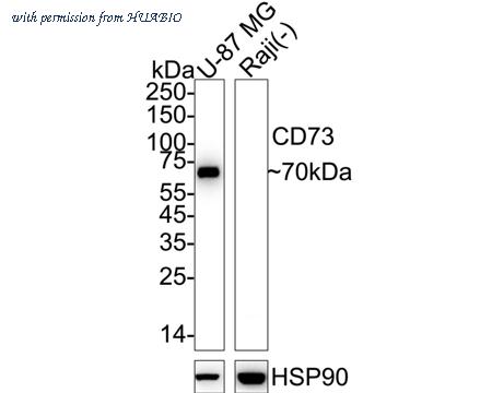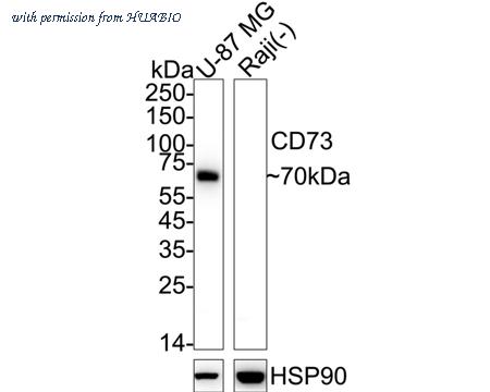 Western blot analysis of CD73 on different lysates with Mouse anti-CD73 antibody (HA601004) at 1/2,000 dilution. Lane 1: U-87 MG cell lysate Lane 2: Raji cell lysate (negative) Lysates/proteins at 20 µg/Lane. Predicted band size: 63 kDa Observed band size: 70 kDa Exposure time: 3 seconds; ECL: K1801; 4-20% SDS-PAGE gel. Proteins were transferred to a PVDF membrane and blocked with 5% NFDM/TBST for 1 hour at room temperature. The primary antibody (HA601004) at 1/2,000 dilution was used in 5% NFDM/TBST at 4℃ overnight. Anti-Mouse IgG for IP Nano-secondary antibody (NBI02H) at 1/5,000 dilution was used for 1 hour at room temperature.