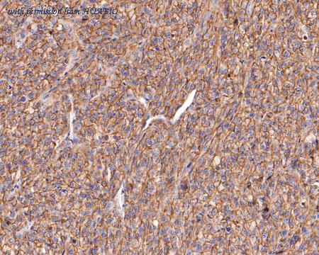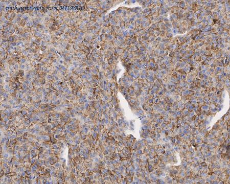 Immunohistochemical analysis of paraffin-embedded U-87 MG xenograft tissue with Mouse anti-CD73 antibody (HA601299) at 1/1,000 dilution. The section was pre-treated using heat mediated antigen retrieval with Tris-EDTA buffer (pH 9.0) for 20 minutes. The tissues were blocked in 1% BSA for 20 minutes at room temperature, washed with ddH2O and PBS, and then probed with the primary antibody (HA601299) at 1/1,000 dilution for 1 hour at room temperature. The detection was performed using an HRP conjugated compact polymer system. DAB was used as the chromogen. Tissues were counterstained with hematoxylin and mounted with DPX.