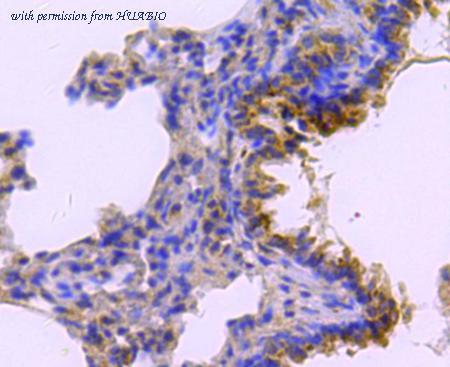 Immunohistochemical analysis of paraffin-embedded rat lung tissue using anti-catalase antibody. Counter stained with hematoxylin.
