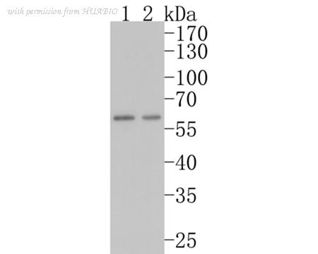 Western blot analysis of Catalase on different lysates. Proteins were transferred to a PVDF membrane and blocked with 5% BSA in PBS for 1 hour at room temperature. The primary antibody (HA750377, 1/500) was used in 5% BSA at room temperature for 2 hours. Goat Anti-Rabbit IgG - HRP Secondary Antibody (HA1001) at 1:200,000 dilution was used for 1 hour at room temperature. Positive control: Lane 1: Hela cell lysate Lane 2: HepG2 cell lysate