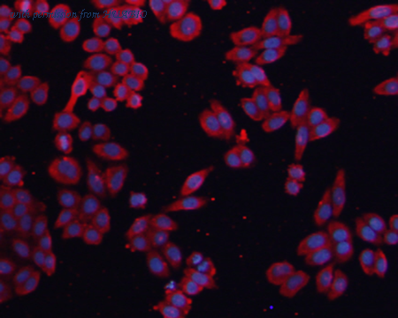 ICC staining catalse in HepG2 cells (red). Cells were fixed in paraformaldehyde, permeabilised with 0.25% Triton X100/PBS.