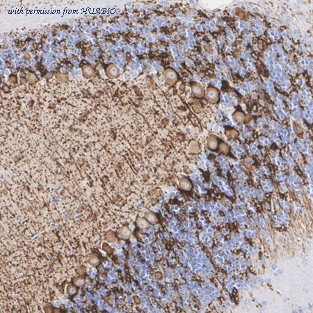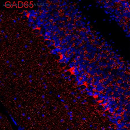 Immunohistochemical analysis of paraffin-embedded mouse cerebellum tissue with Rat anti-GAD65 antibody (HA601389) at 1/1,000 dilution. The section was pre-treated using heat mediated antigen retrieval with Tris-EDTA buffer (pH 9.0) for 20 minutes. The tissues were blocked in 1% BSA for 20 minutes at room temperature, washed with ddH2O and PBS, and then probed with the primary antibody (HA601389) at 1/1,000 dilution for 1 hour at room temperature. The detection was performed using an HRP conjugated compact polymer system. DAB was used as the chromogen. Tissues were counterstained with hematoxylin and mounted with DPX.