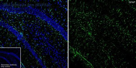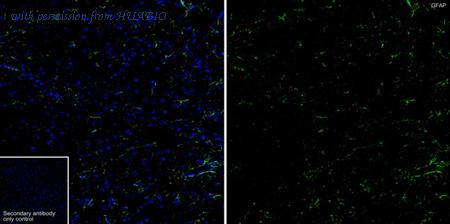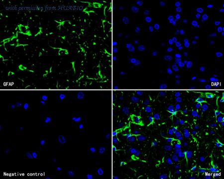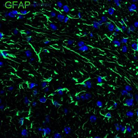 Immunofluorescence analysis of paraffin-embedded rat brain tissue labeling GFAP with Mouse anti-GFAP antibody (HA600101F) at 1/100 dilution. The section was pre-treated using heat mediated antigen retrieval with Tris-EDTA buffer (pH 9.0) for 20 minutes. The tissues were blocked in 10% negative goat serum for 1 hour at room temperature, washed with PBS, and then incubated overnight with GFAP-iFluor™ 488 (HA600101F, green) at 1/100 dilution overnight at +4℃ , washed with PBS. Nuclear DNA was labelled in blue with DAPI.