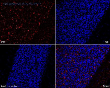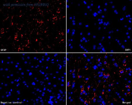 Immunofluorescence analysis of paraffin-embedded rat brain tissue labeling GFAP with Mouse anti-GFAP antibody (HA600102F) at 1/200 dilution. The section was pre-treated using heat mediated antigen retrieval with Tris-EDTA buffer (pH 9.0) for 20 minutes. The tissues were blocked in 10% negative goat serum for 1 hour at room temperature, washed with PBS, and then incubated overnight with GFAP-iFluor™ 594 (HA600102F, red) at 1/200 dilution overnight at +4℃ , washed with PBS. Nuclear DNA was labelled in blue with DAPI.