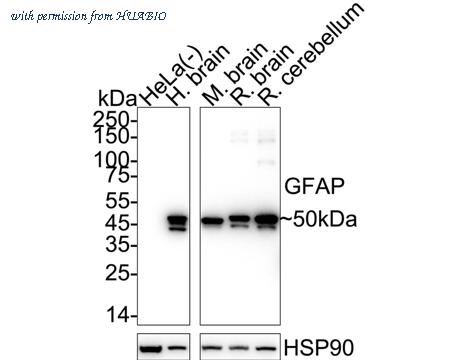 Western blot analysis of GFAP on different lysates with Mouse anti-GFAP antibody (HA601380) at 1/2,000 dilution. Lane 1: HeLa cell lysate (negative) Lane 2: Human brain tissue lysate Lane 3: Mouse brain tissue lysate Lane 4: Rat brain tissue lysate Lane 5: Rat cerebellum tissue lysate Lysates/proteins at 20 µg/Lane. Predicted band size: 50 kDa Observed band size: 50 kDa Exposure time: 10 seconds; ECL: K1801; 4-20% SDS-PAGE gel. Proteins were transferred to a PVDF membrane and blocked with 5% NFDM/TBST for 1 hour at room temperature. The primary antibody (HA601380) at 1/2,000 dilution was used in 5% NFDM/TBST at 4℃ overnight. Goat Anti-Mouse IgG - HRP Secondary Antibody (HA1006) at 1/50,000 dilution was used for 1 hour at room temperature.