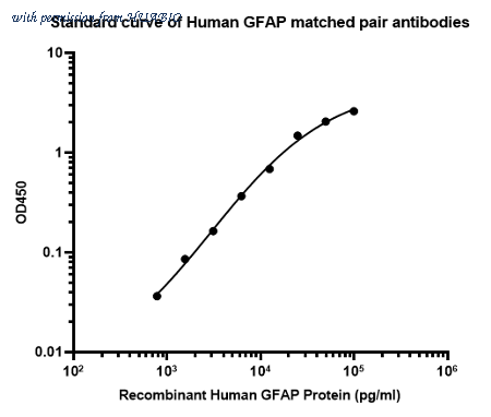 Sandwich ELISA analysis of Human GFAP matched pair antibodies Elisa assay was performed by coating wells of a 96-well plate with 100 µl per well of capture antibody (HA722234) diluted in carbonate/bicarbonate buffer, at a concentration of 5 µg/ml overnight at 4℃. Wells of the plate were washed, blocked with 150 µl 0.05% tween-20 1%BSA blocking buffer, and incubated with serial diluted Recombinant human GFAP protein (HA210990) starting from 100000 pg/ml to 0 pg/ml and detect antibody (HA601342, Biotin, 0.2 µg/ml) for 1 hour at 30℃ with shaking. Then the plate was washed and incubated with 100 µl per well of SA-HRP for 0.5 hour at 30℃ with shaking. Detection was performed using an Ultra TMB Substrate for 10 minutes at room temperature in the dark. The reaction was stopped with sulfuric acid and absorbances were read on a spectrophotometer at 450 nm.