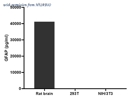 The concentrations of GFAP were interpolated from the GFAP standard curve and corrected for sample dilution. The mean GFAP concentration was determined to be 41.29 ng/ml in rat brain tissue extract. There was no detectable signal in 293T and NIH/3T3 cell extract.