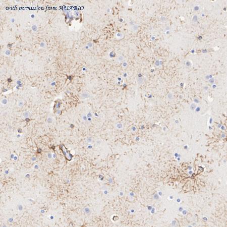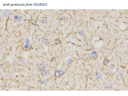 Immunohistochemical analysis of paraffin-embedded human brain tissue with Mouse anti-GFAP antibody (HA610225) at 1/1,000 dilution. The section was pre-treated using heat mediated antigen retrieval with Tris-EDTA buffer (pH 9.0) for 20 minutes. The tissues were blocked in 1% BSA for 20 minutes at room temperature, washed with ddH2O and PBS, and then probed with the primary antibody (HA610225) at 1/1,000 dilution for 1 hour at room temperature. The detection was performed using an HRP conjugated compact polymer system. DAB was used as the chromogen. Tissues were counterstained with hematoxylin and mounted with DPX.