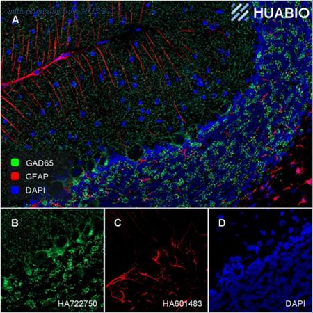 Application: IHC-Fr Species: Rat Site: cerebellum Sample: Frozen section Antibody concentration: 1/1,000 (GFAP, HA601483, Rat, red); 1/500 (GAD65, HA722750, Rabbit, green) Antigen retrieval: Not required