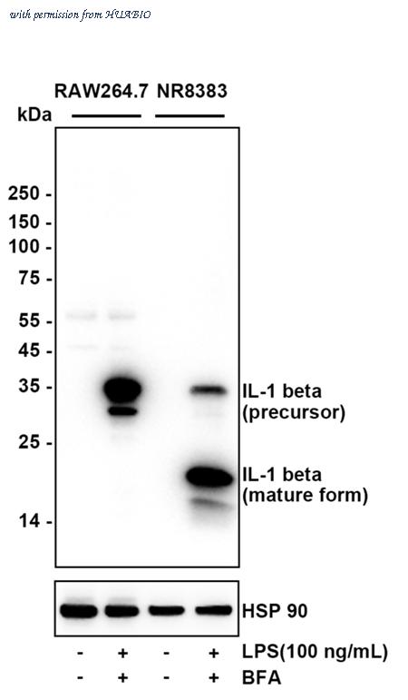 Western blot analysis of IL-1 beta on different lysates with Rabbit anti-IL-1 beta antibody (HA723965) at 1/2,000 dilution. Lane 1: RAW264.7 cell lysate Lane 2: RAW264.7 treated with 100ng/mL LPS for 4 hours then add 300ng/mL BFA for 3 hours cell lysate Lane 3: NR8383 cell lysate Lane 4: NR8383 treated with 100ng/mL LPS for 4 hours then add 1μg/mL BFA for 3 hours cell lysate Lysates/proteins at 15 µg/Lane. Predicted band size: 31 kDa Observed band size: 35/20 kDa Exposure time: 20 seconds; ECL: K1801; 4-20% SDS-PAGE gel. Proteins were transferred to a PVDF membrane and blocked with 5% NFDM/TBST for 1 hour at room temperature. The primary antibody (HA723965) at 1/2,000 dilution was used in primary antibody dilution (K1803) at 4℃ overnight. Goat Anti-Rabbit IgG - HRP Secondary Antibody (HA1001) at 1/50,000 dilution was used for 1 hour at room temperature.