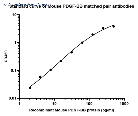 Sandwich ELISA analysis of Mouse PDGF-BB matched pair antibodies Capture: HA723810, Mouse PDGF-BB Rabbit mAb [PSH16-05] Detector: HA723811, Mouse PDGF-BB Rabbit mAb [PSH16-06] Elisa assay was performed by coating wells of a 96-well plate with 100 µl per well of capture antibody (HA723810) diluted in carbonate/bicarbonate buffer, at a concentration of 2ug/ml overnight at 4℃. Wells of the plate were washed, blocked with 150 µl 0.05% tween-20 1% BSA blocking buffer, and incubated with serial diluted Recombinant Mouse PDGF-BB protein (HA211037) protein starting from 500 pg/ml to 0 pg/ml and detect antibody (HA723811, Biotin, 0.2 µg/ml) for 1 hour at 30℃ with shaking. Then the plate was washed and incubated with 100 µl per well of SA-HRP for 0.5 hour at 30℃ with shaking. Detection was performed using an Ultra TMB Substrate for 10 minutes at room temperature in the dark. The reaction was stopped with sulfuric acid and absorbances were read on a spectrophotometer at 450 nm.