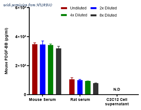 Interpolated concentrations of native PDGF-BB in mouse and rat samples. Capture: HA723810, Mouse PDGF-BB Rabbit mAb [PSH16-05] Detector: HA723811, Mouse PDGF-BB Rabbit mAb [PSH16-06] Interpolated concentration of native PDGF-BB was measured in duplicate at different sample concentrations. The interpolated dilution factor corrected values were plotted (mean +/- SD, n=2). The mean PDGF-BB concentration was determined to be 32,761 pg/mL in mouse Serum and 8,427 pg/ml in rat serum. There was no detectable signal in C2C12 cell culture supernatant.