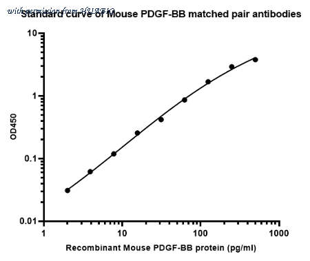 Sandwich ELISA analysis of Mouse PDGF-BB matched pair antibodies Capture: HA723812, Mouse PDGF-BB Rabbit mAb [PSH16-07] Detector: HA723811, Mouse PDGF-BB Rabbit mAb [PSH16-06] Elisa assay was performed by coating wells of a 96-well plate with 100 µl per well of capture antibody (HA723812) diluted in carbonate/bicarbonate buffer, at a concentration of 2ug/ml overnight at 4℃. Wells of the plate were washed, blocked with 150 µl 0.05% tween-20 1% BSA blocking buffer, and incubated with serial diluted Recombinant Mouse PDGF-BB protein (HA211037) protein starting from 500 pg/ml to 0 pg/ml and detect antibody (HA723811, Biotin, 0.2 µg/ml) for 1 hour at 30℃ with shaking. Then the plate was washed and incubated with 100 µl per well of SA-HRP for 0.5 hour at 30℃ with shaking. Detection was performed using an Ultra TMB Substrate for 10 minutes at room temperature in the dark. The reaction was stopped with sulfuric acid and absorbances were read on a spectrophotometer at 450 nm.