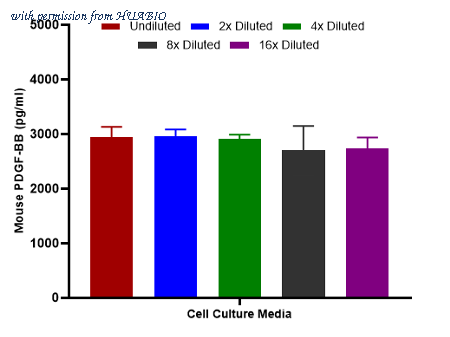 Interpolated concentrations of spiked PDGF-BB in cell culture media samples. Capture: HA723810, Mouse PDGF-BB Rabbit mAb [PSH16-05] Detector: HA723811, Mouse PDGF-BB Rabbit mAb [PSH16-06] The concentrations of PDGF-BB were measured in duplicates, interpolated from the PDGF-BB standard curves and corrected for sample dilution. Undiluted samples are as follows: cell culture media 50%. The interpolated dilution factor corrected values are plotted (mean +/- SD, n=2).