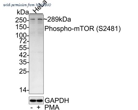 Western blot analysis of Phospho-mTOR (S2481) on different lysates with Rabbit anti-Phospho-mTOR (S2481) antibody (HA721632) at 1/5,000 dilution. Lane 1: HeLa whole cell lysate Lane 2: HeLa starved overnight then treated with 200nM PMA for 4 hours whole cell lysate Lysates/proteins at 20 µg/Lane. Predicted band size: 289 kDa Observed band size: 289 kDa Exposure time: 5 minutes; 4-20% SDS-PAGE gel. Proteins were transferred to a PVDF membrane and blocked with 5% NFDM/TBST for 1 hour at room temperature. The primary antibody (HA721632) at 1/5,000 dilution was used in 5% NFDM/TBST at 4℃ overnight. Goat Anti-Rabbit IgG - HRP Secondary Antibody (HA1001) at 1:50,000 dilution was used for 1 hour at room temperature.