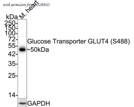 Western blot analysis of Phospho-Glucose Transporter GLUT4 (S488) on mouse heart tissue lysates (no heat) with Rabbit anti-Phospho-Glucose Transporter GLUT4 (S488) antibody (HA721866) at 1/1,000 dilution. Notice: no heat means the lysate is not boiled. Lysates/proteins at 30 µg/Lane. Predicted band size: 55 kDa Observed band size: 50 kDa Exposure time: 3 minutes; 4-20% SDS-PAGE gel. Proteins were transferred to a PVDF membrane and blocked with 5% NFDM/TBST for 1 hour at room temperature. The primary antibody (HA721866) at 1/1,000 dilution was used in 5% NFDM/TBST at 4℃ overnight. Goat Anti-Rabbit IgG - HRP Secondary Antibody (HA1001) at 1/50,000 dilution was used for 1 hour at room temperature.