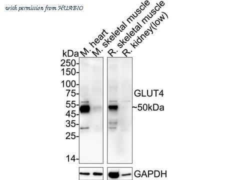 Western blot analysis of Glucose Transporter GLUT4 on different lysates with Rabbit anti-Glucose Transporter GLUT4 antibody (R1402-3) at 1/2,000 dilution. Lane 1: Mouse heart tissue lysate (no heat) Lane 2: Mouse skeletal muscle tissue lysate (no heat) Lane 3: Rat skeletal muscle tissue lysate (no heat) Lane 4: Rat kidney tissue lysate (low expression) (no heat) Notice: no heat means the lysate is not boiled. Lysates/proteins at 20 µg/Lane. Predicted band size: 55 kDa Observed band size: 50 kDa Exposure time: 1 minute; ECL: K1801; 4-20% SDS-PAGE gel. Proteins were transferred to a PVDF membrane and blocked with 5% NFDM/TBST for 1 hour at room temperature. The primary antibody (R1402-3) at 1/2,000 dilution was used in 5% NFDM/TBST at 4℃ overnight. Goat Anti-Rabbit IgG - HRP Secondary Antibody (HA1001) at 1/50,000 dilution was used for 1 hour at room temperature.