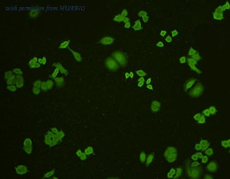 ICC staining GLUT4 in MCF-7 cells (green). Cells were fixed in paraformaldehyde, permeabilised with 0.25% Triton X100/PBS.