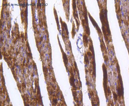 Immunohistochemical analysis of paraffin-embedded mouse heart tissue using anti-GLUT4 antibody. Counter stained with hematoxylin.