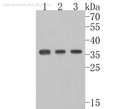 Western blot analysis of Aquaporin 4 on different lysates. Proteins were transferred to a PVDF membrane and blocked with 5% BSA in PBS for 1 hour at room temperature. The primary antibody (HA500125, 1/500) was used in 5% BSA at room temperature for 2 hours. Goat Anti-Rabbit IgG - HRP Secondary Antibody (HA1001) at 1:5,000 dilution was used for 1 hour at room temperature. Positive control: Lane 1: Rat brain tissue lysate Lane 2: Mouse lung tissue lysate Lane 3: Human stomach tissue lysate